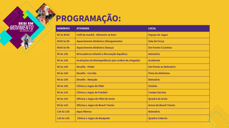 Entre as atividades oferecidas, destaque para os Desafios de Pedal, Corrida e Natação. Além disso, as famílias poderão aproveitar o evento com tranquilidade, pois as crianças terão um espaço garantido para se divertir: o Balneário do SESI oferecerá recreação aquática com acompanhamento de estagiários especializados. Confira a programação: